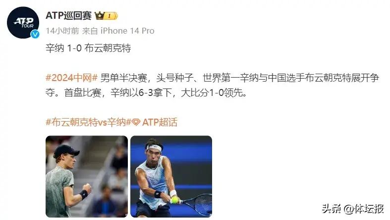 第一盤首局,辛納輕鬆保發成功;小布在第二局不依不饒驚險保發追平;第三局辛納拿下後堅韌的小布立即回敬保發再次追平;第五局雙方展開拉鋸,但實力更勝一籌的辛納保發成功;第六局小布發球輪明顯體能下滑被破發,最終辛納6-3贏下第一盤。第二盤小布先發,憑藉發球輪1-0佔得先機,第二局辛納發球輪也很快拿下1-1,第三局小布輕鬆保發2-1反超,第四局辛納也保發成功2-2,兩人就這樣你來我往進入搶七。儘管小布保住了自己全部6個發球局,但辛納在關鍵分爭奪上連續祭出高質量發球,最終以7-6(3)拿下。但這已經是中國男網球員挑戰世界第一最接近勝利的一次。