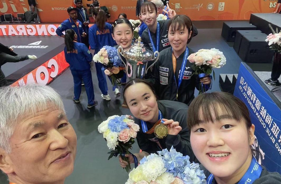 日乒曬奪冠自拍!5個女孩笑容燦爛,領獎臺上謙讓捧杯,好和諧