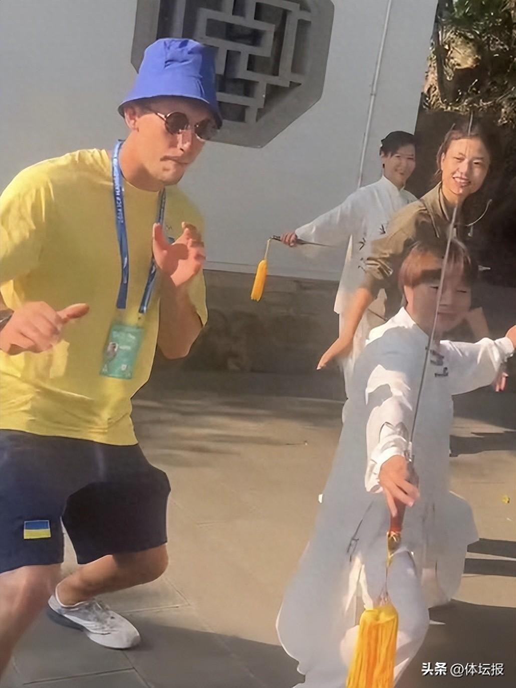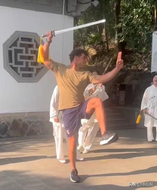 中外頂級皮划艇運動員在富陽逛公園學太極劍