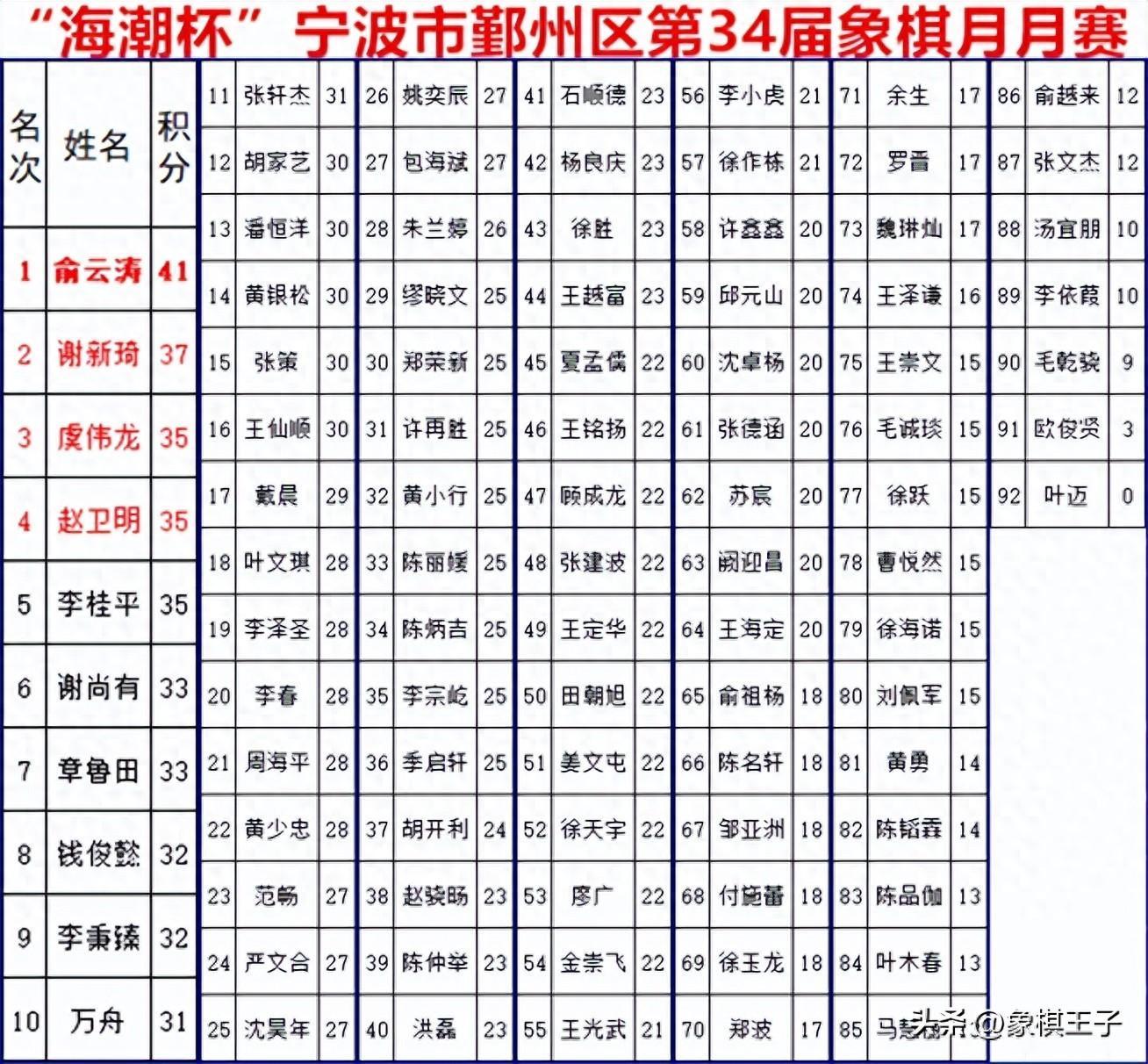 前業餘棋王爭霸賽總冠軍謝新琦發揮不俗,贏了魚大之後,收穫亞軍,麗水趙衛明則贏了謝新琦,取得殿軍。