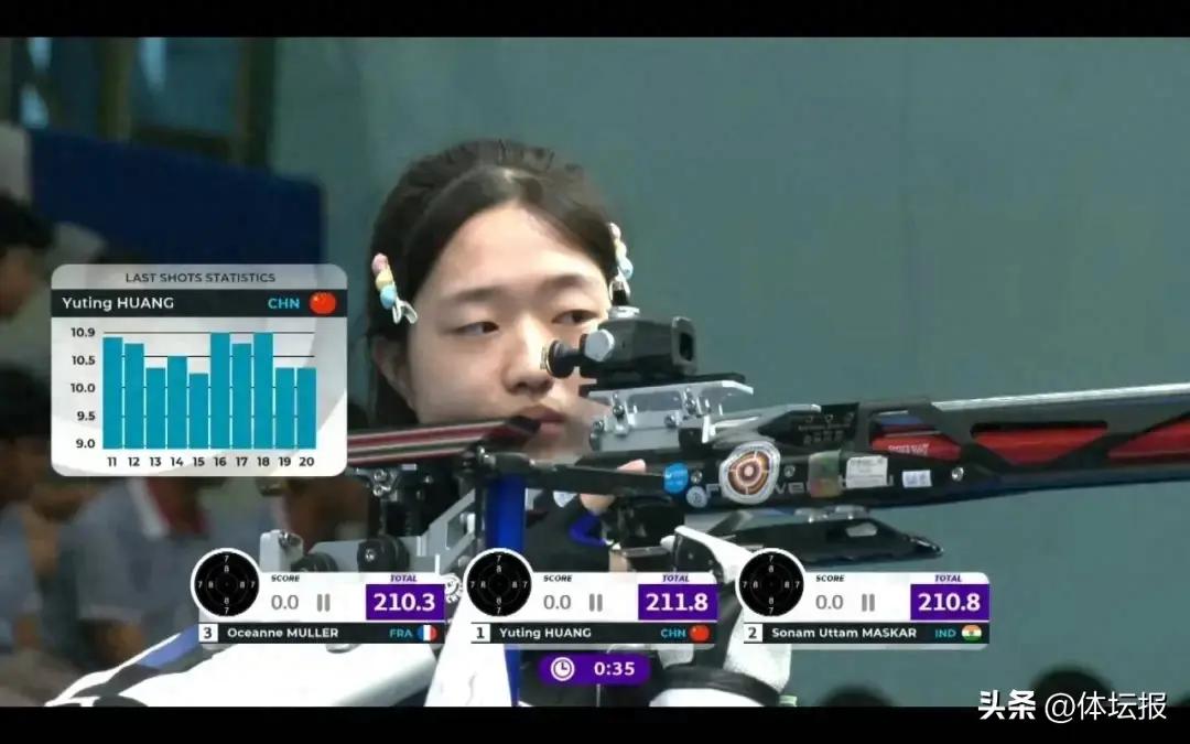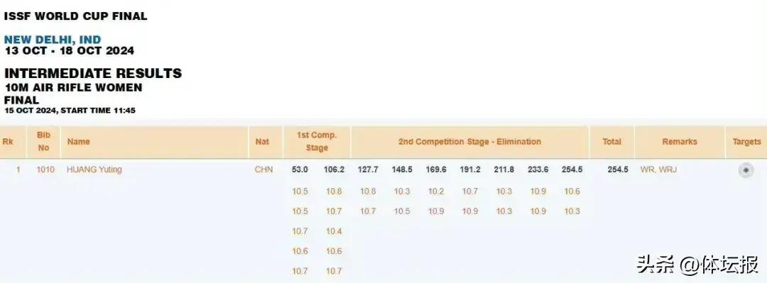 10月15日,國際射聯射擊世界盃總決賽在印度新德里打響。在當天進行的女子10米氣步槍決賽中,浙江運動員、奧運冠軍黃雨婷以254.5環的好成績不負衆望拿下冠軍,該成績也打破了女子氣步槍決賽世界紀錄。