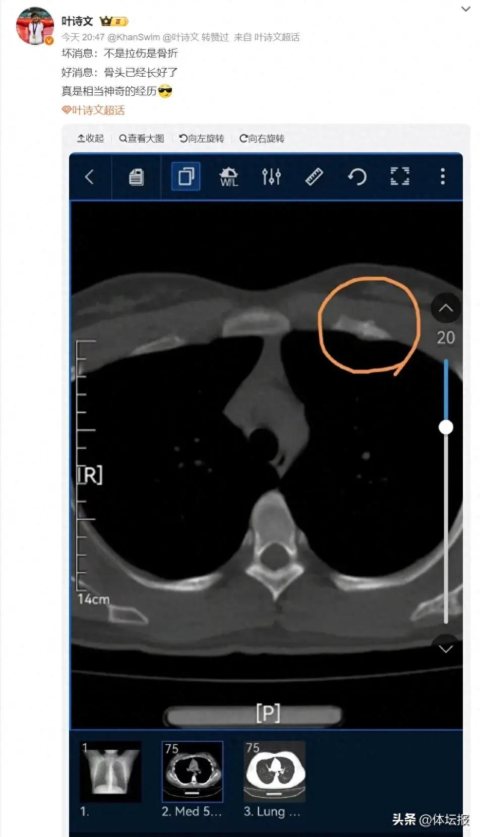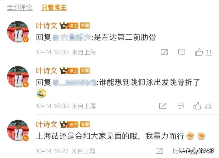 10月14日晚,葉詩文在個人社交媒體平臺上更新了她的最新動態。在發佈的消息中,葉詩文透露,她之前的傷勢並非拉傷,而是骨折。