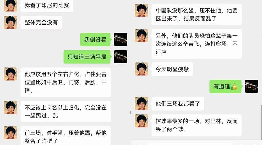 賽前,多數人的預測可能和我一樣,我的預測是印尼不敗,但堅決看好中國的也有,比如黃健翔老師,賽前一天,他就發博文表示看好中國隊。半場結束時,我在微信裏和健翔聊了一會兒,下面是聊天截圖,他分析得挺透徹。