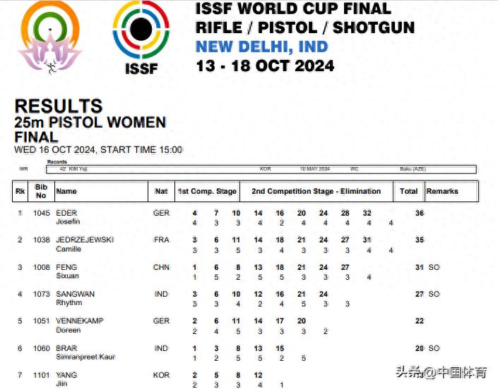 中國體育訊 北京時間10月16日晚,在印度新德里舉行的2024年射擊世界盃總決賽女子25米手槍決賽中,中國選手馮思璇以31中獲得銅牌。另一位中國選手趙楠無緣決賽。該項目冠軍被德國選手埃德爾以36中奪得,法國選手耶德爾澤耶夫斯基以35中獲得亞軍。(完)