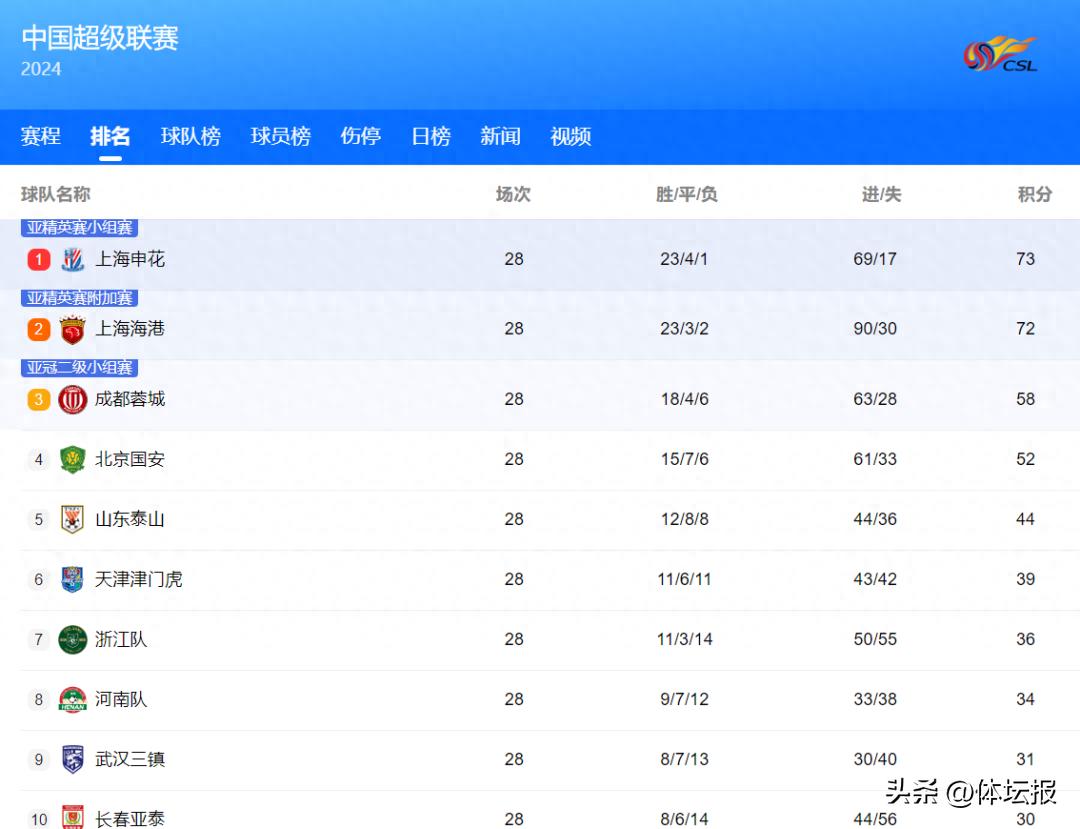 在本輪比賽中,本賽季大部分輪次領跑的衛冕冠軍上海海港隊,在客場以1比3不敵成都蓉城隊。而此前暫列積分榜第2位的申花隊則憑藉老將吳曦的破門,以2比1逆轉取勝河南隊,從而在積分榜實現反超。
