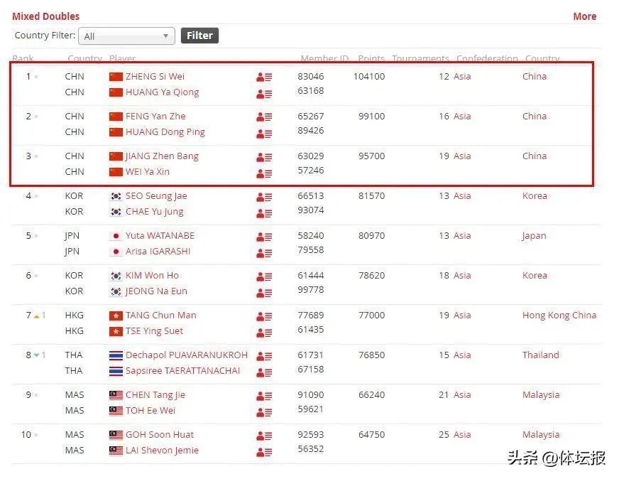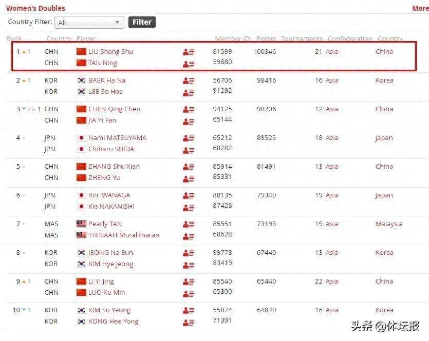 中國女雙組合劉聖書/譚寧超越隊友賈一凡/陳清晨首次登頂世界第一,復出後獲得丹麥公開賽亞軍的安洗瑩重返女單世界第一,國羽男單石宇奇、男雙梁偉鏗/王昶、混雙鄭思維/黃雅瓊繼續位列各單項第一,這樣目前五項世界排名國羽依然佔據了四項第一。