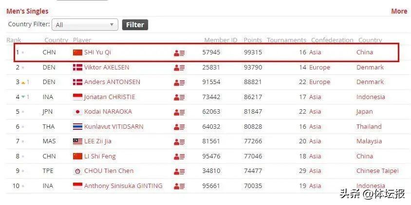 男單項目,處於休戰狀態的石宇奇保持住了世界排名第一的位置。奧運冠軍安賽龍和丹麥名將安東森位居第二和第三,中國另外一位選手李詩灃世界第八的位置沒有變動。