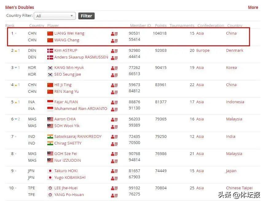 男雙項目,剛剛在丹麥公開賽上奪冠的梁王組合(梁偉鏗/王昶)拉開了與第二名的距離繼續位居世界第一寶座,另外一對中國組合何濟庭/任翔宇世界排名上升到了第四。