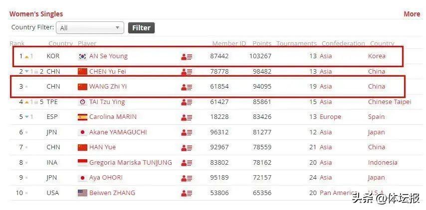 女單項目,隨着安洗瑩丹麥公開賽復出並奪得亞軍,安洗瑩也理所當然地重登世界第一寶座,處於排名保護中的浙江名將陳雨菲排名變成第二。值得一提的是,剛剛在丹麥公開賽擊敗安洗瑩的王祉怡世界排名歷史性地來到了第三,她和目前世界排名第七的韓悅將參加年底在杭州舉行的年終總決賽。