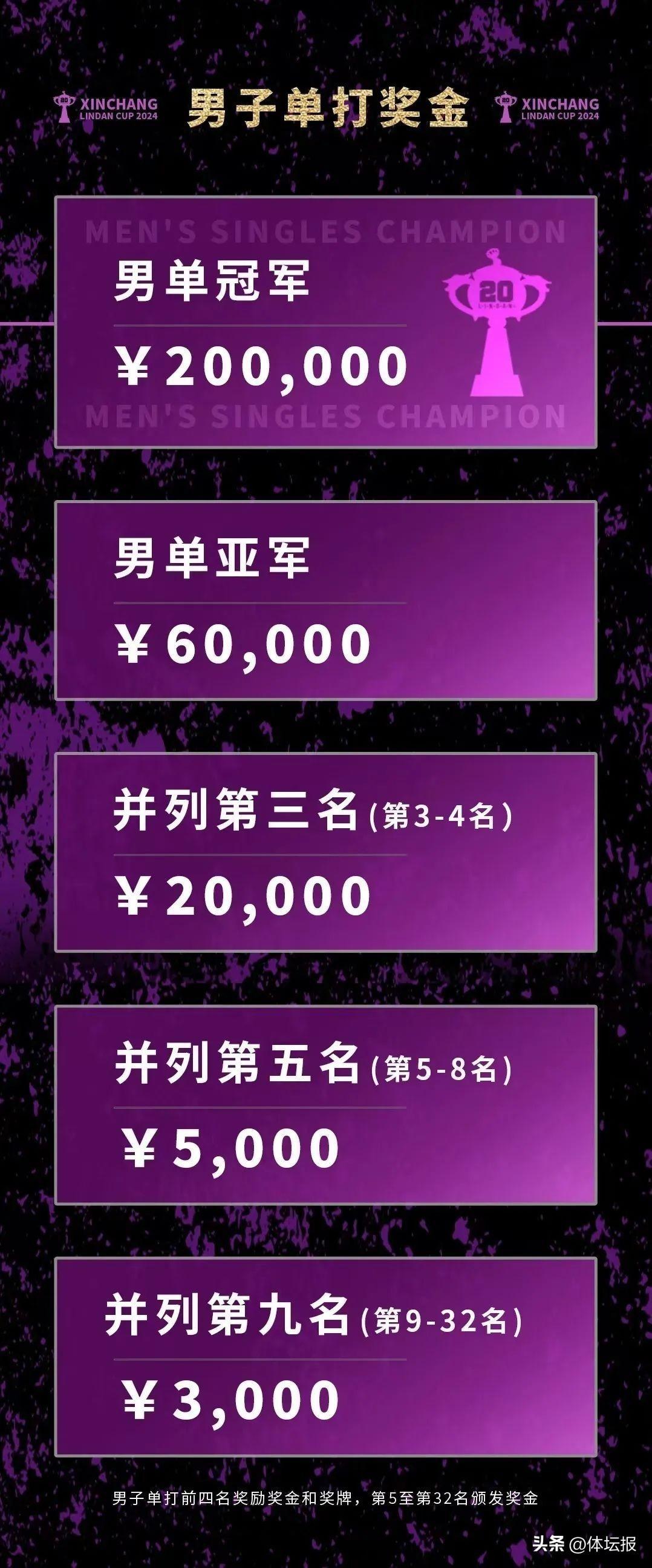 爲了激勵選手們更加奮勇拼搏,本次新昌林丹杯公開賽的獎金也實現了大幅提升。男子單打冠軍的獎金從去年的15萬元提高至20萬元,這一數字已經對標世界羽聯超級500賽事單項冠軍的獎金水平。