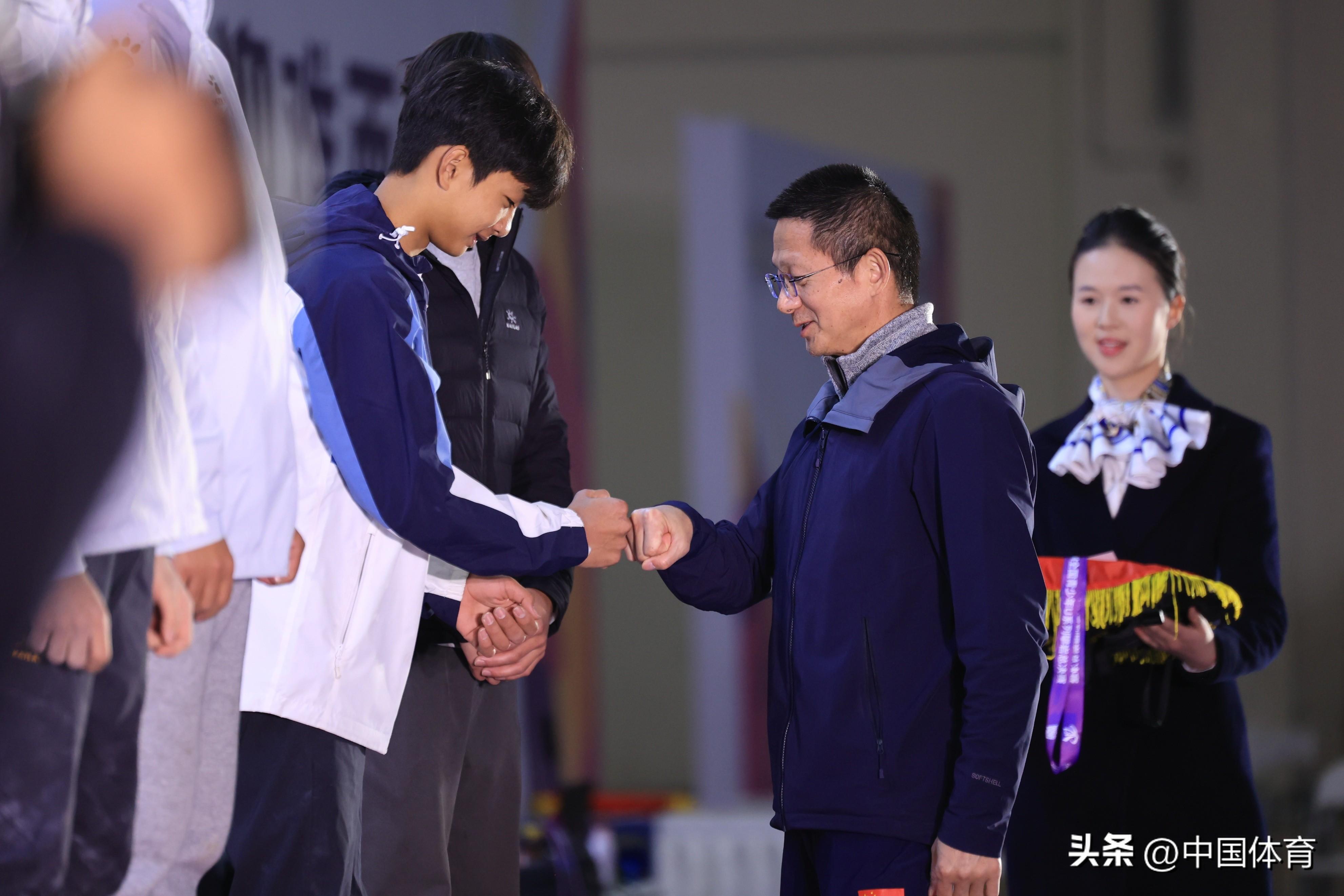 國家體育總局登山運動管理中心青少年發展部主任丁祥華(前排右)頒獎前祝賀獲獎選手
