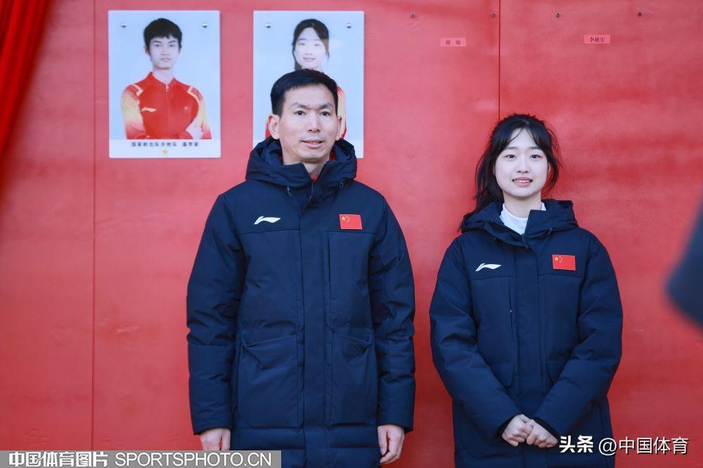 黃雨婷和指導教練葛宏磚(右)在奧運冠軍榜前合影留念