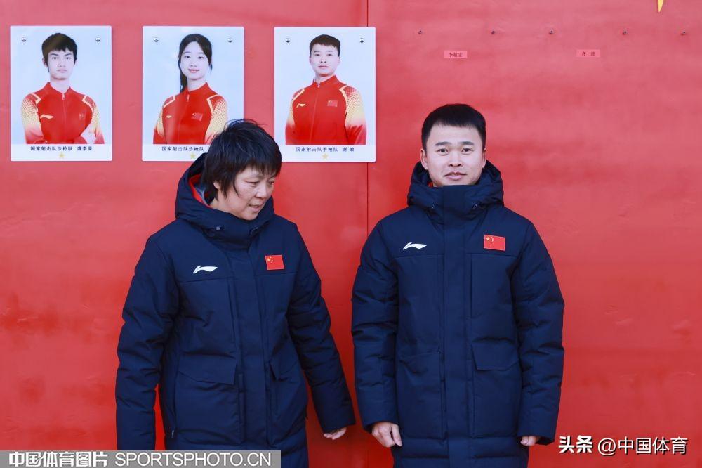 謝瑜和指導教練黃文紅(左)在洛杉磯奧運週期射擊射箭國家隊“世界冠軍榜”前合影留念