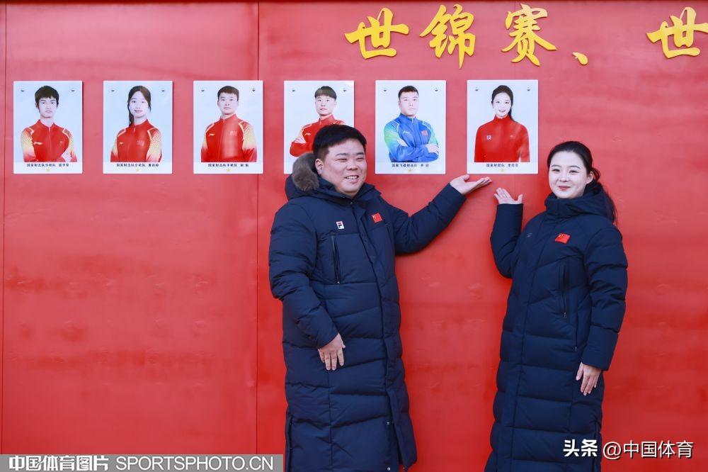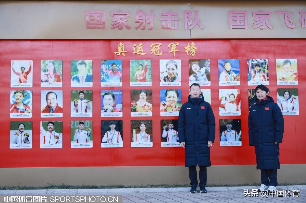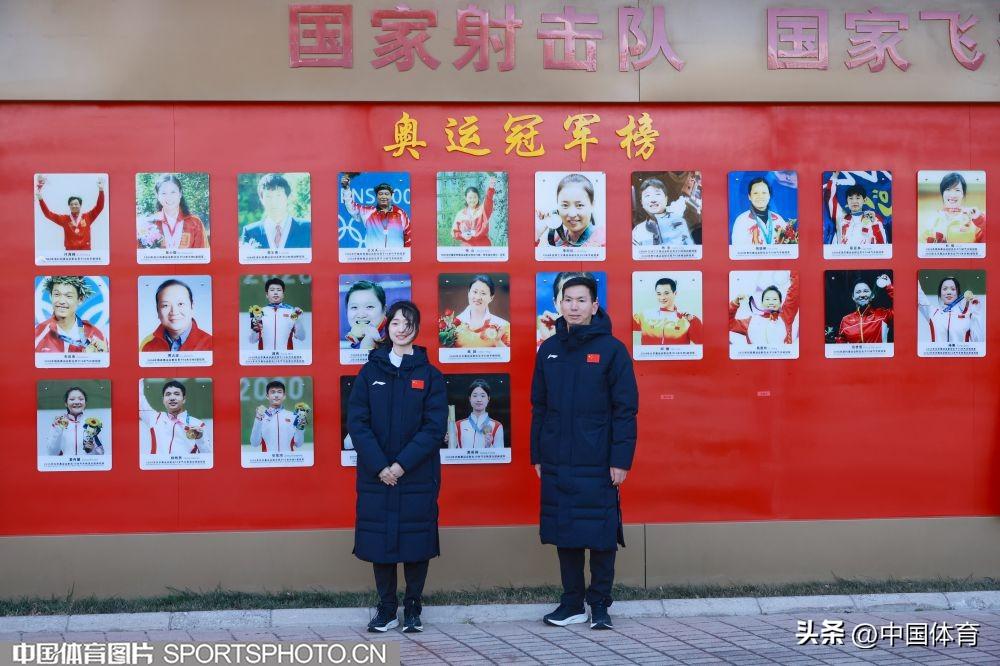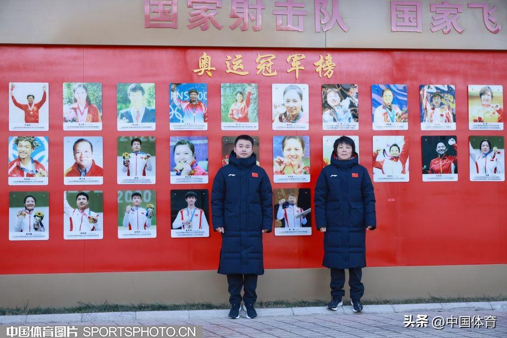 黃雨婷和指導教練葛宏磚(左)在洛杉磯奧運週期射擊射箭國家隊“世界冠軍榜”前合影留念