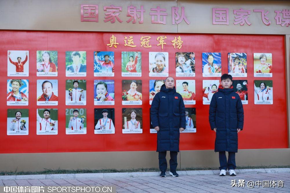 盛李豪和指導教練姚燁(左)洛杉磯奧運週期射擊射箭國家隊“世界冠軍榜”前合影留念