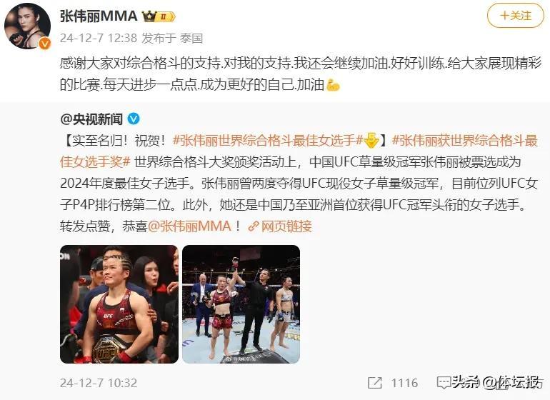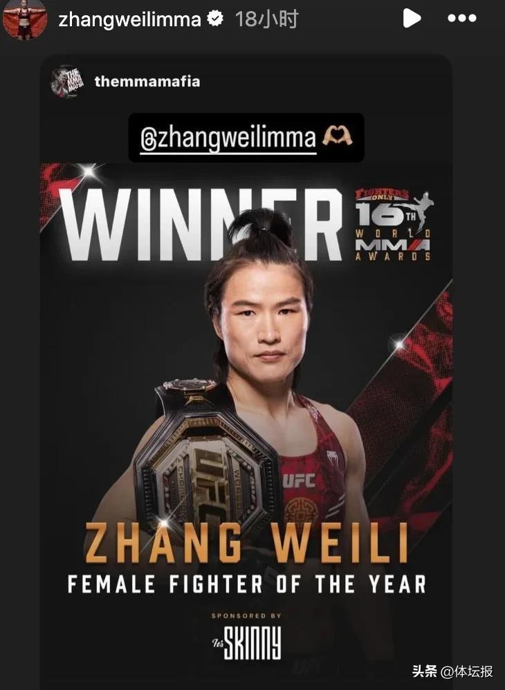 據悉,該獎項此前幾屆的獲獎者包括UFC名將瓦倫蒂娜·舍甫琴科、阿曼達·努涅斯以及前UFC前冠軍霍利·霍爾姆、米莎·塔特和隆達·羅西。此番獲獎後,張偉麗通過視頻遠程發表了獲獎感言: