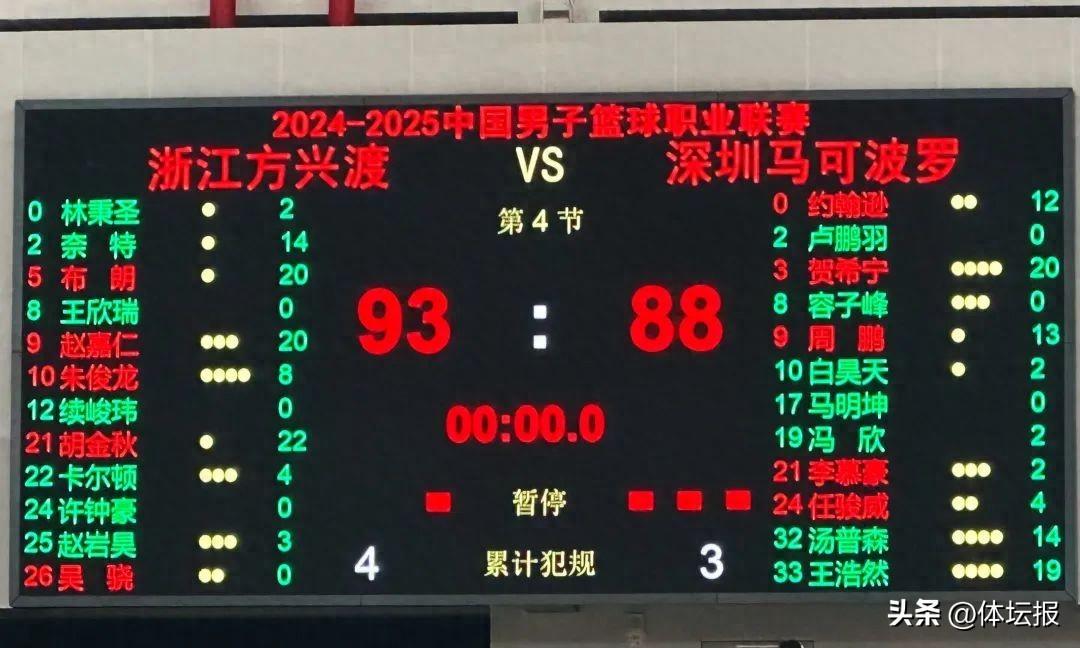 12月10日晚,浙江方興渡繼續主場作戰,迎來與深圳馬可波羅的賽季首次對決。最終,在缺少孫銘徽的情況下,方興渡以93:88力克對手,取得主場九連勝。此役,方興渡四人得分上雙,胡金秋拿到全場最高的22分10籃板,趙嘉仁、布朗均貢獻20分,其中趙嘉仁一人投進6記三分,奈特得到14分;深圳則有五人得分上雙,賀希寧拿到全隊最高的20分。