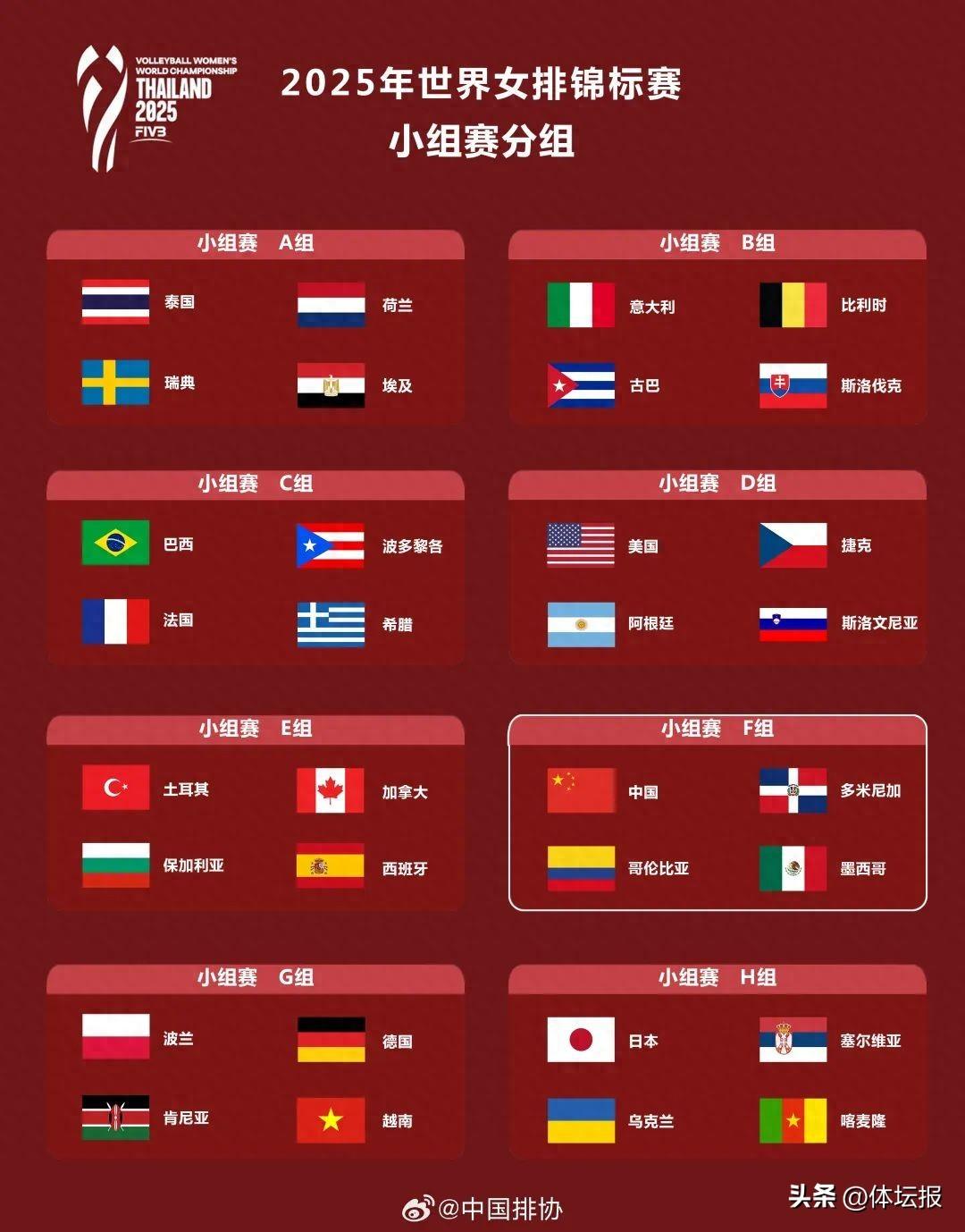 北京時間12月17日,2025年女排世錦賽小組抽籤儀式在泰國舉行,中國女排與多米尼加、哥倫比亞、墨西哥分在F組。