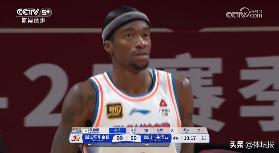 下半場比賽,浙江男籃用瓊斯和劉澤一進行配合。西蒙斯本節爆發,籃下外線頻頻得手、裏突外投幫助浙江迅速建立比分優勢。四川這邊也不甘示弱,艾德蒙本場一人獨得54分,其中第三節貢獻了20分,第三節比賽結束,四川隊將比分追至92:95,僅僅落後浙江男籃3分。