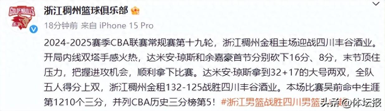 12月17日晚,CBA常規賽浙江稠州金租男籃回到主場對陣四川男籃,最終浙江男籃以132:125戰勝四川,迎來五連勝。