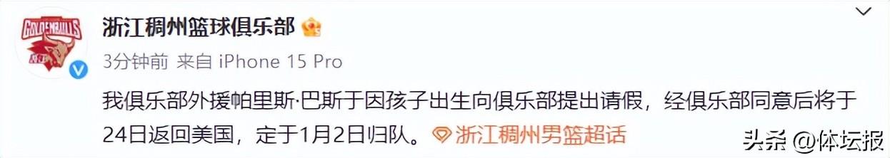 浙江稠州金租男籃將於12月25日在廣東男籃主場進行下一場對決。另外,據俱樂部今晚發佈的最新消息,外援巴斯因孩子出生請假,將於24日返回美國,定於1月2日歸隊。