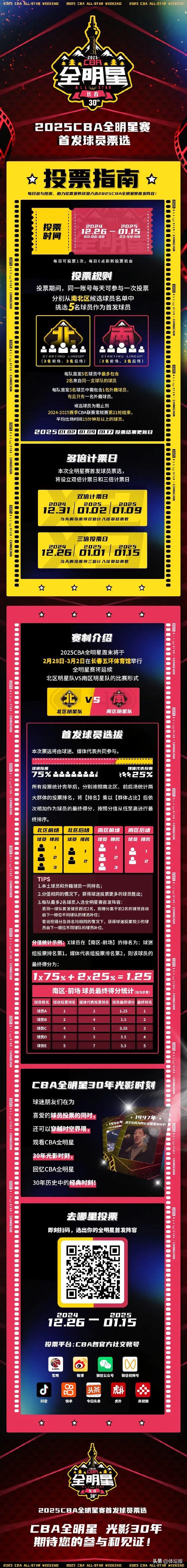 12月26日,2025CBA全明星賽首發球員票選正式啓動,將持續至2025年1月15日。
