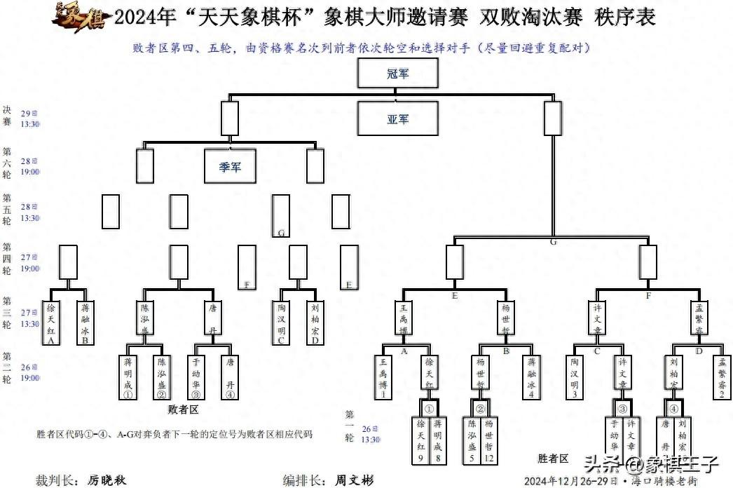 賽會27日下午一點半、晚上七點,進行第3、4輪淘汰戰的強力大斗,從勝者組直入決賽的棋手即將產生,敗者組中則步步驚心,前路好戲,象棋王子抖音號持續全程直播。