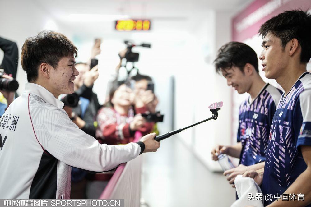 青島仁洲俱樂部選手梁偉鏗(左)採訪國家隊搭檔王昶(右二)