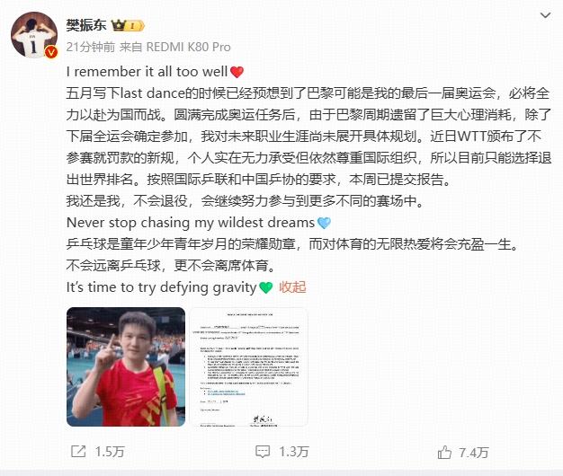 重磅!樊振東退出WTT世界排名,發文:巴黎或是自己最後一屆奧運
