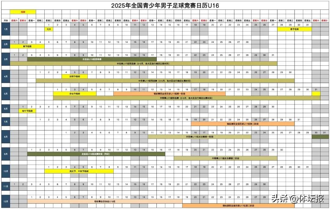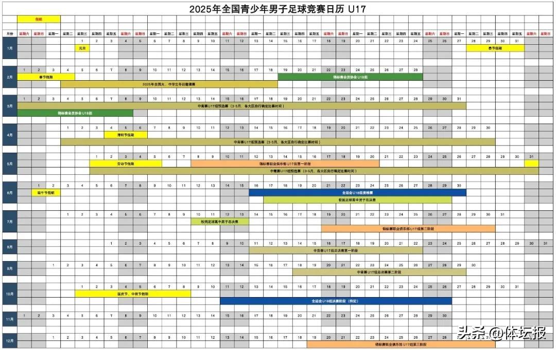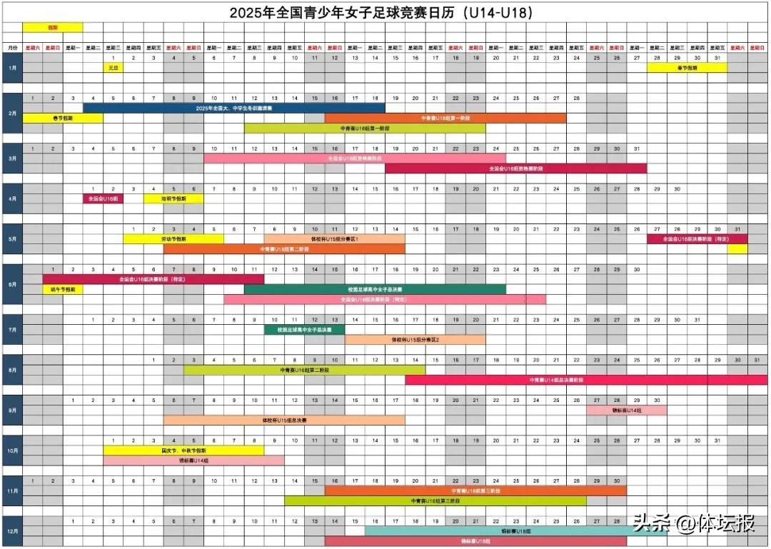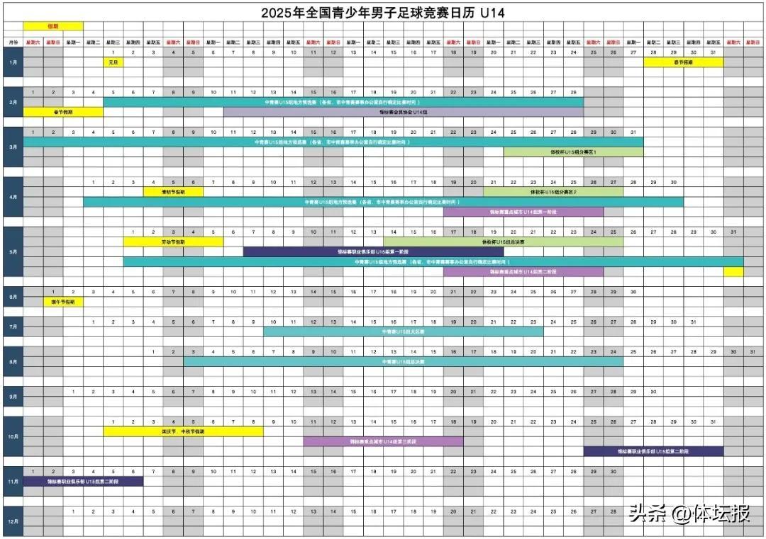 這份競賽日曆涉及男子U13至U18共6個年齡段和女子U14至U18共5個年齡段的球員,包含中青賽、足球重點城市的比賽、中國足協會員協會的比賽、體校杯、職業俱樂部梯隊的比賽、全運會比賽、全國大中學生冬訓邀請賽、校園足球高中男女總決賽等賽事。如全運會分爲U16、U18和U20三個組別,U20組別暫未列入此次競賽日曆,需要和U19中青賽、U21聯賽協調賽程,這兩個組別的賽事也未列入此次賽歷。之所以未列入19歲及以上賽事,原因是這些賽事可以計爲成人賽事;中國青少年足球聯賽U13、U15、U17和U19共四個組別。其中U13和U15組別爲地方預選賽、大區賽和總決賽三個層級;U17組分爲大區預選賽、總決賽第一階段和第二階段三個層級;U19組目前尚未出臺賽程賽制,比賽會統一報名、統一組織。