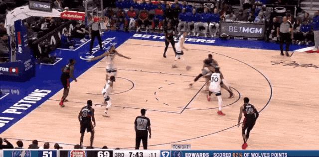 然後是這場比賽裏最意味深長的回合。在第三節還剩7分47秒時,坎寧安在三分線右側45度拿到了球,愛德華茲在防守他。坎寧安運球突破,躲過了蘭德爾的協防刷卡,殺到內線之後迎來了戈貝爾的協防。他連續做了兩個投籃假動作,戈貝爾不爲所動,看起來這個回合已經打死了,戈貝爾向後稍稍退了半步,想要防止他把球傳給內切的杜倫,就在這一刻,坎寧安第三次抬手,把愛德華茲騙到了空中,頂着犯規打成了2+1。