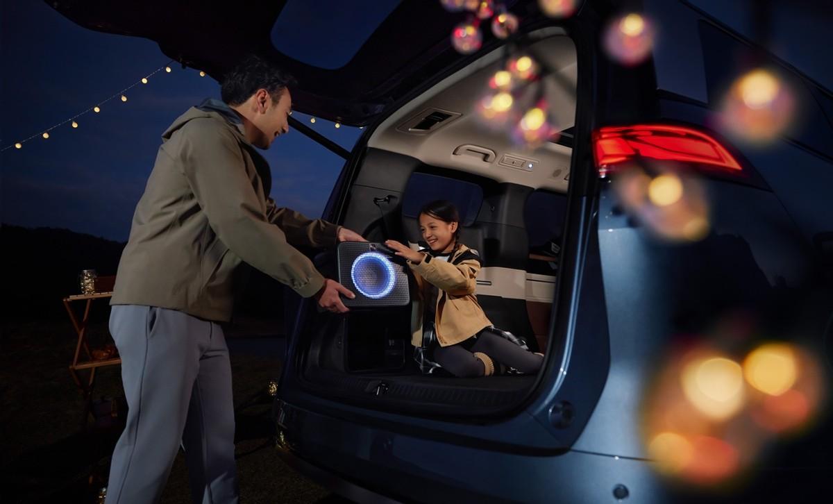 值得一提的是,夏的第三排音箱可單獨拆卸爲戶外藍牙音箱,電池容量15000mAh,外放功率達170W,續航長達9小時,支持車友雙音箱互聯、外接麥克風,車載車充,無需單獨充電,極大拓展了戶外影音娛樂玩法。