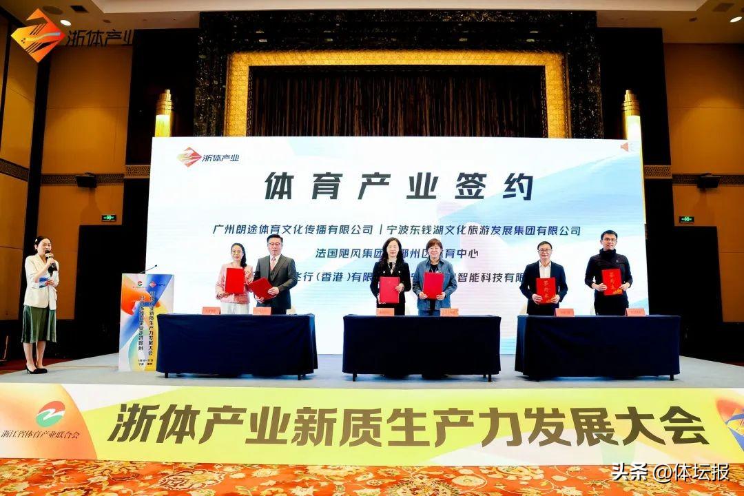 會上還舉行了體育產業簽約儀式。廣州朗途體育文化傳播有限公司與寧波東錢湖文化旅遊發展集團有限公司、法國颶風集團與鄞州區體育中心、天基航空飛行(香港)有限公司與寧波五浪智能科技有限公司達成戰略合作協議。