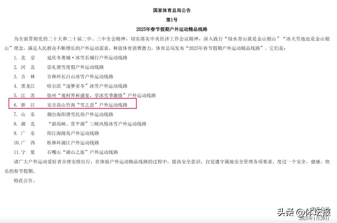 體育總局推薦,浙江有1條上榜!