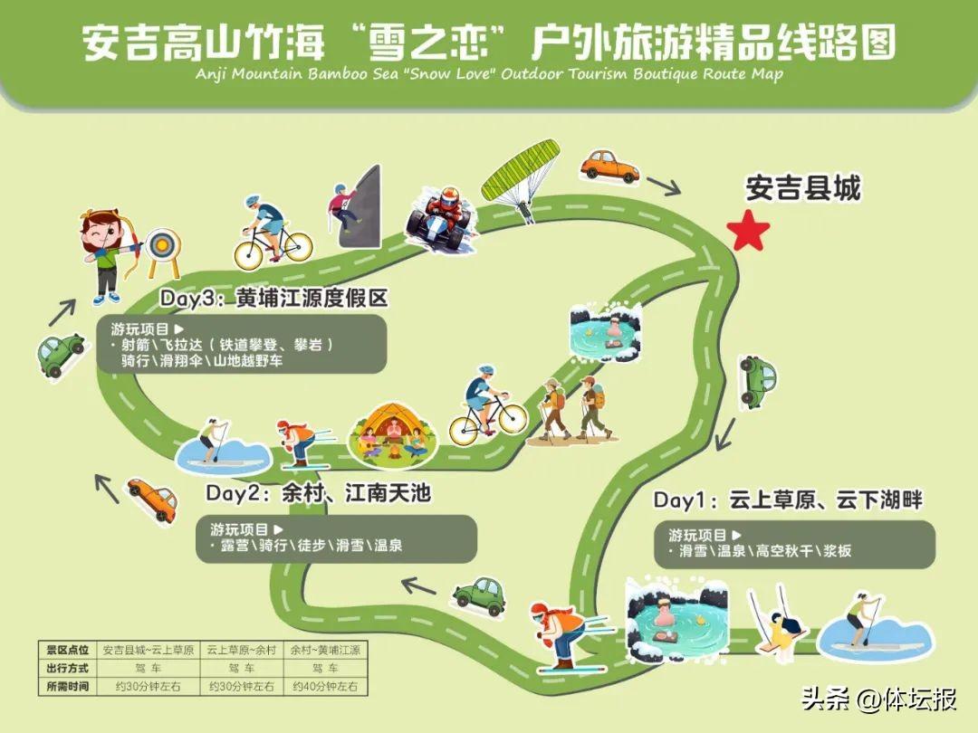 安吉線路主要設計春節期間戶外登山、戶外徒步、戶外滑雪三大主題活動,沿途均有配套晚上的高中低各等級住宿、餐飲、交通等基礎設施,完全可以匹配春節期間各類人羣赴安吉開展戶外運動體驗。