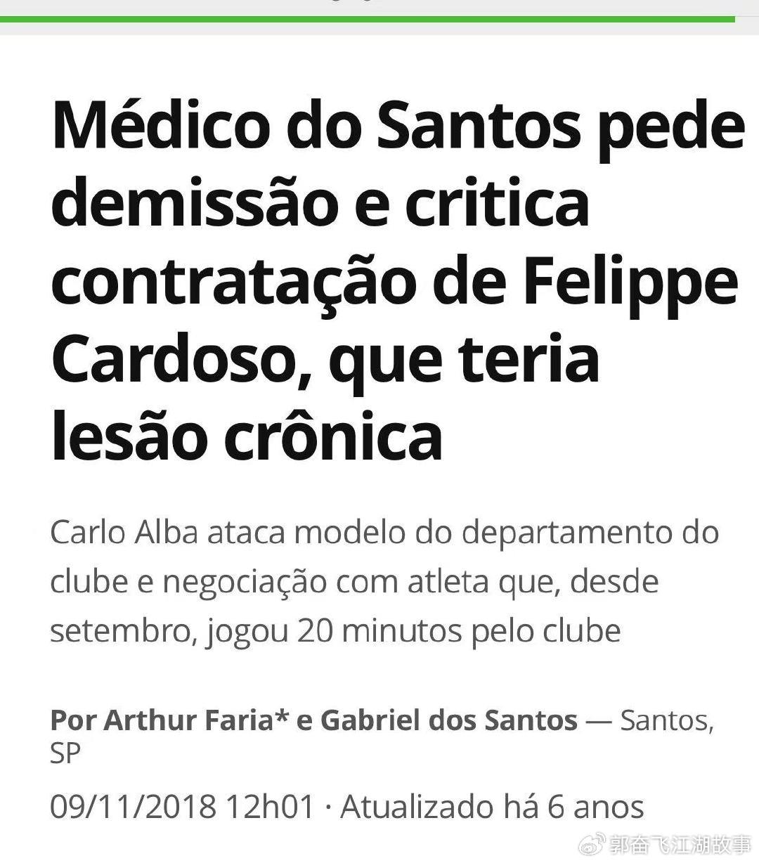 這篇文章的標題是“桑托斯的醫生辭職,並批評僱用費利佩·卡多索,因爲後者有慢性傷病”。文中表示:骨科醫生卡洛·阿爾巴(Carlo Alba)發表聲明,稱他上週四從桑托斯辭職,原因是與醫療部門負責人的分歧。