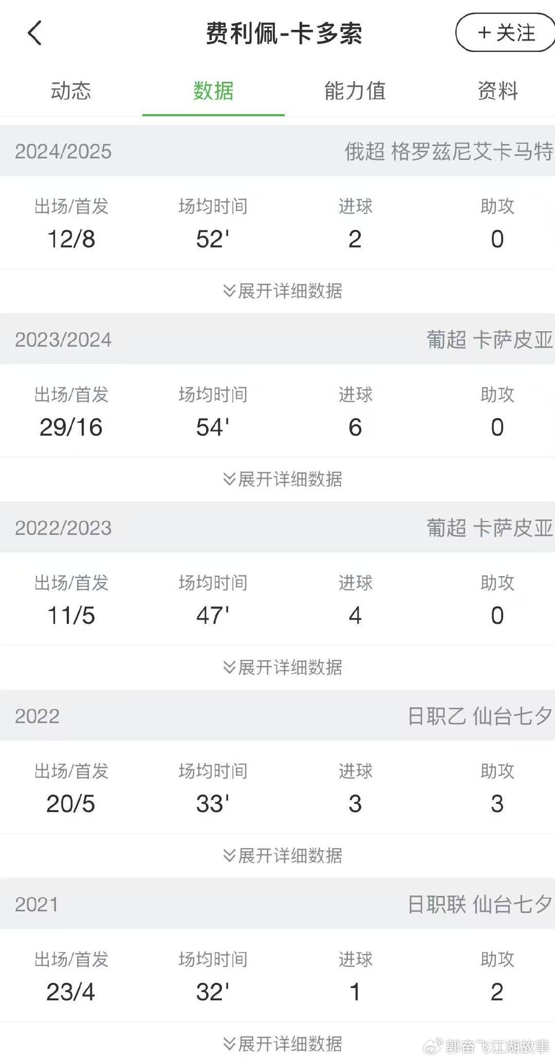 資料顯示,2024年7月,卡多索以150萬歐轉會到俄超,之後他有12次出場,首發8次,進了兩個球,場均出場時間也只有52分鐘。