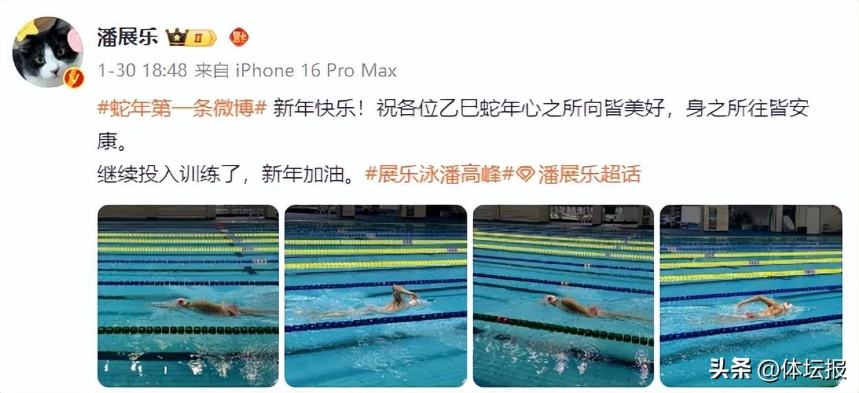 大年初二,潘展樂在社交平臺上曬出自己春節訓練的圖片,並配文:“新年快樂!祝各位乙巳蛇年心之所向皆美好,身之所往皆安康。繼續投入訓練了,新年加油。”照片中的他,專注而認真,展現出了游泳運動員的堅韌與毅力。這些圖片不僅記錄了他春節期間的訓練生活,也傳遞出了他對游泳事業的熱愛與執着。
