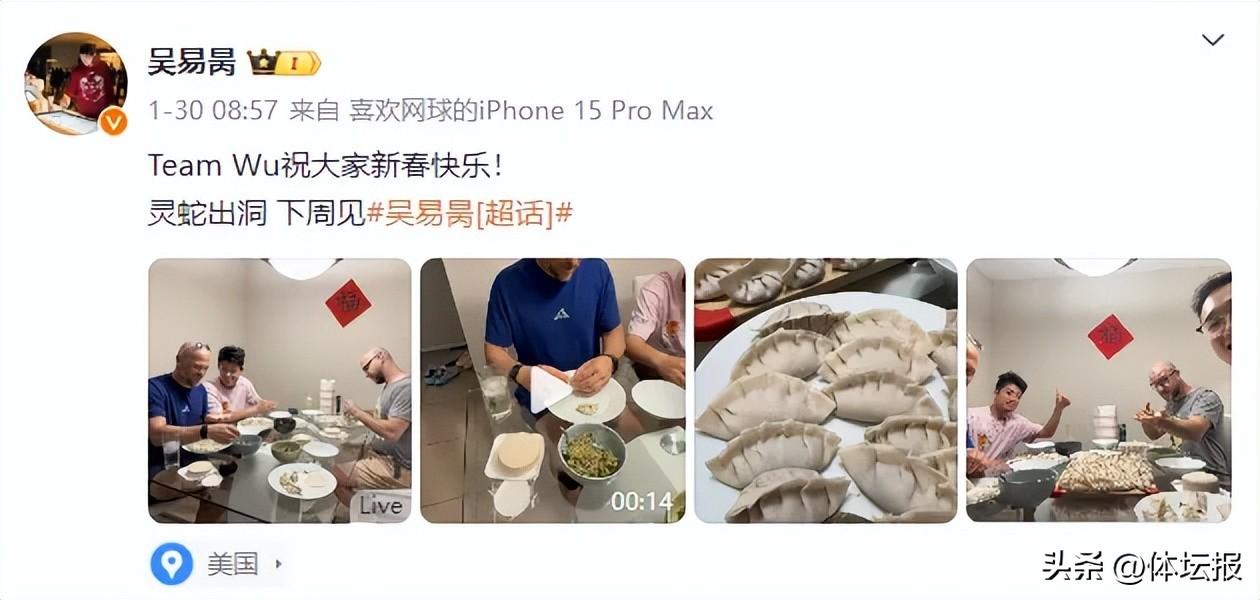 吳易昺在美國進行冬訓,今年也在那裏度過春節。他在社交媒體曬出自己和團隊成員一起包餃子的畫面,並配文:“靈蛇出洞,下週見!”不出意外,他將在ATP500達拉斯站亮相。