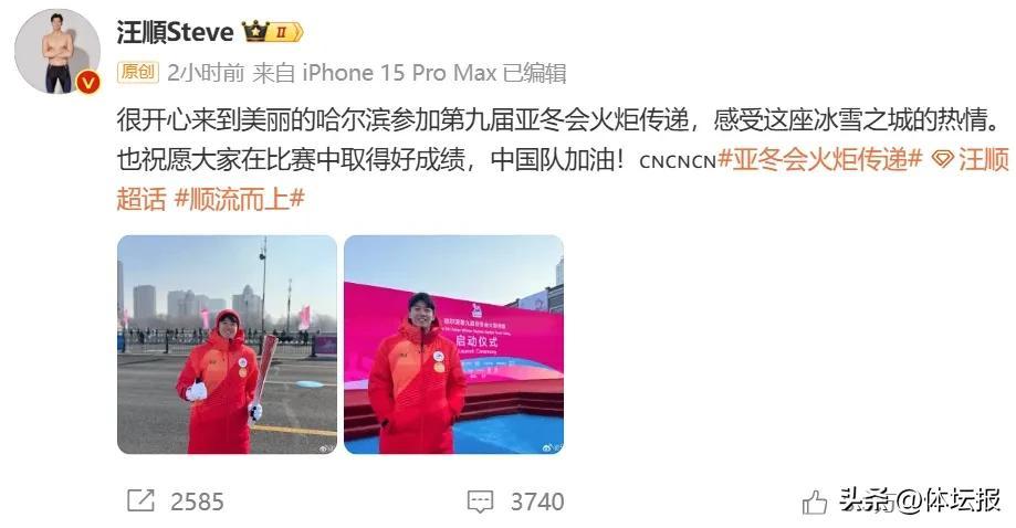 “很開心來到美麗的哈爾濱參加第九屆亞冬會火炬傳遞,感受這座冰雪之城的熱情。”汪順發文表示,希望中國隊在比賽中取得好成績,爲他們加油!