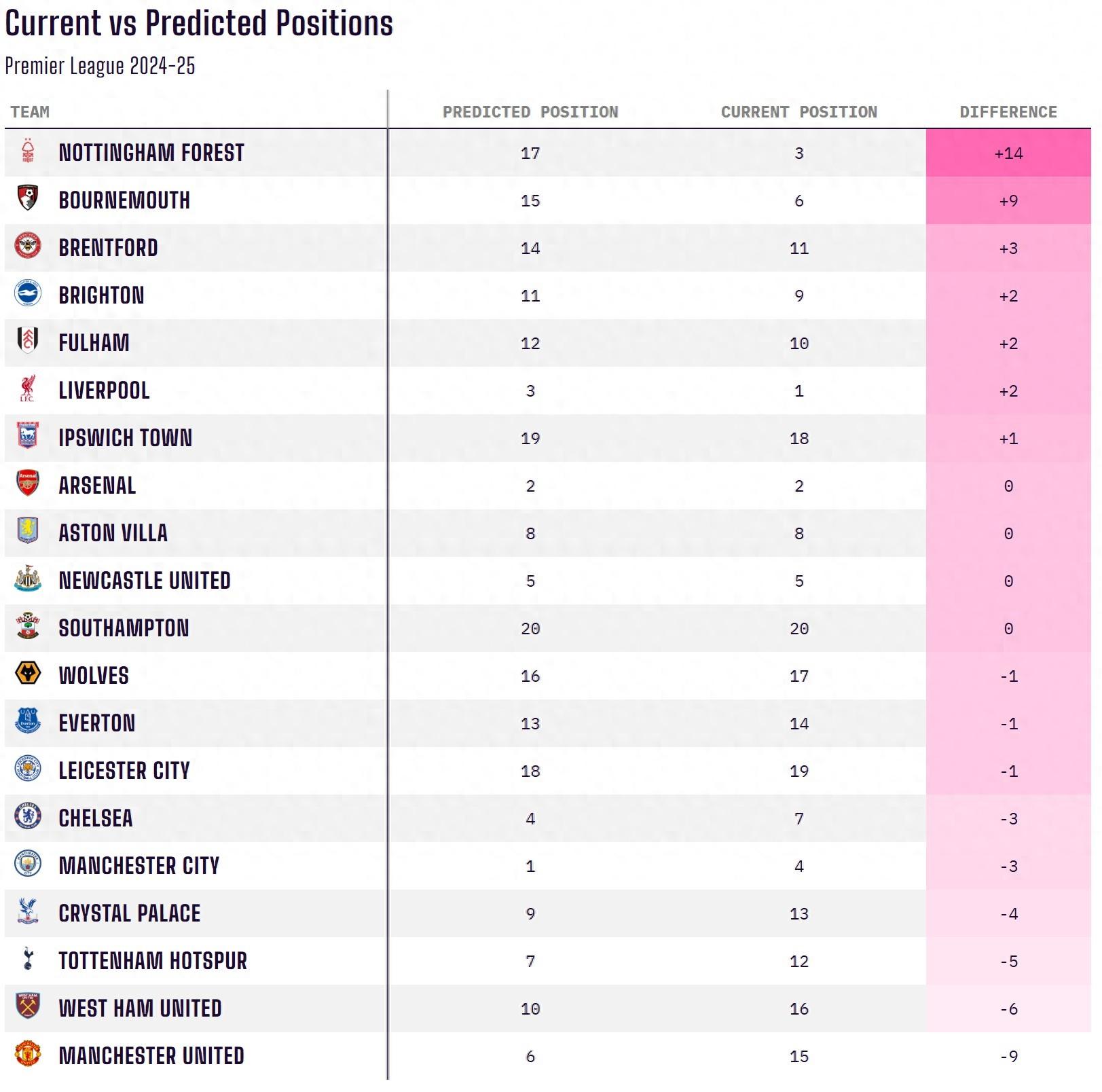 根據OPTA大數據的賽前預測,曼聯在本賽季應該在英超排名第6位,但是現在他們排名15,下降了9位,而賽前預測將排到17名的諾丁漢森林則是上升最多的,目前他們還在英超第三的位置。