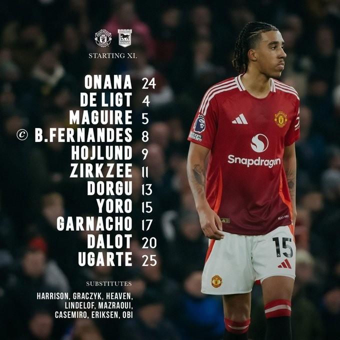曼聯vs伊普斯維奇:霍伊倫、加納喬首發,烏加特、B費出戰
