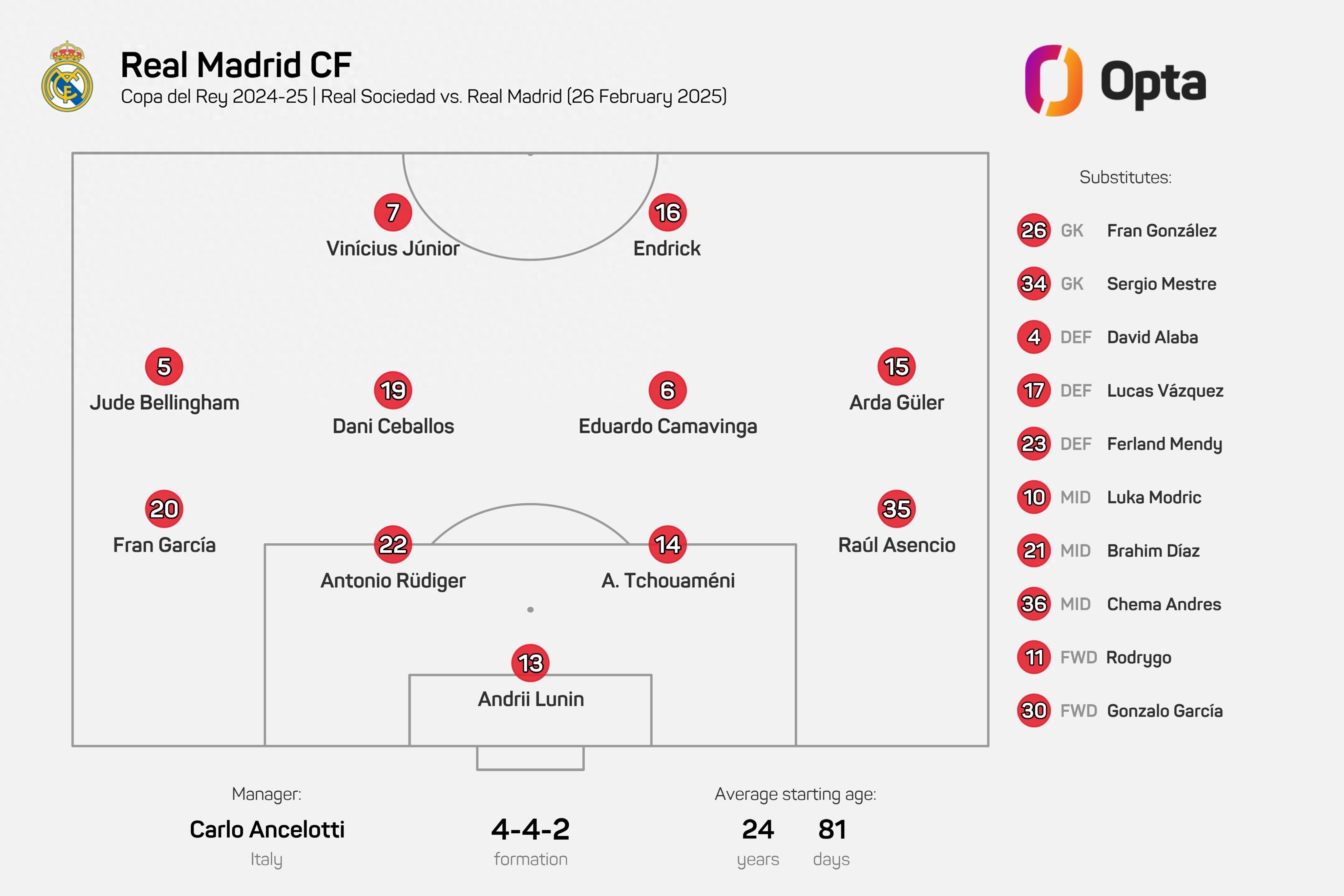 替補:26-弗蘭-岡薩雷斯、34-塞爾希奧-梅斯特雷、4-阿拉巴、10-莫德里奇、11-羅德里戈、17-巴斯克斯、21-卜拉欣-迪亞斯、23-費蘭-門迪、30-貢薩洛-加西亞、36-切馬-安德烈斯