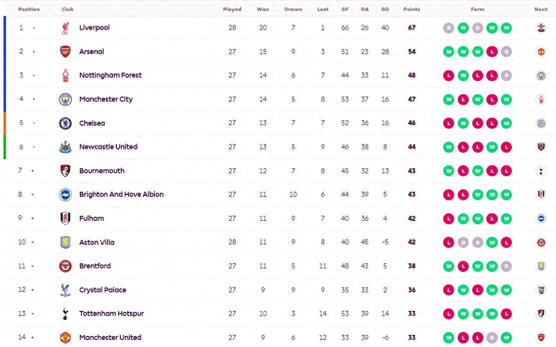 北京時間2月27日,英超第27輪激戰多場,僅剩西漢姆聯VS萊斯特城一役,積分榜情況如下:
