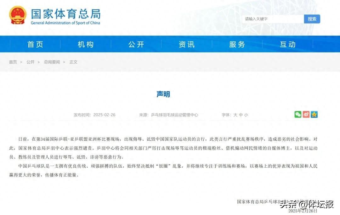 2月26日,國家體育總局乒乓球羽毛球運動管理中心在國家體育總局官網發佈聲明,強烈譴責嚴重擾亂第34屆國際乒聯-亞乒聯盟亞洲盃賽場秩序、造成惡劣社會影響的行爲,並將會同相關部門進行嚴厲打擊。