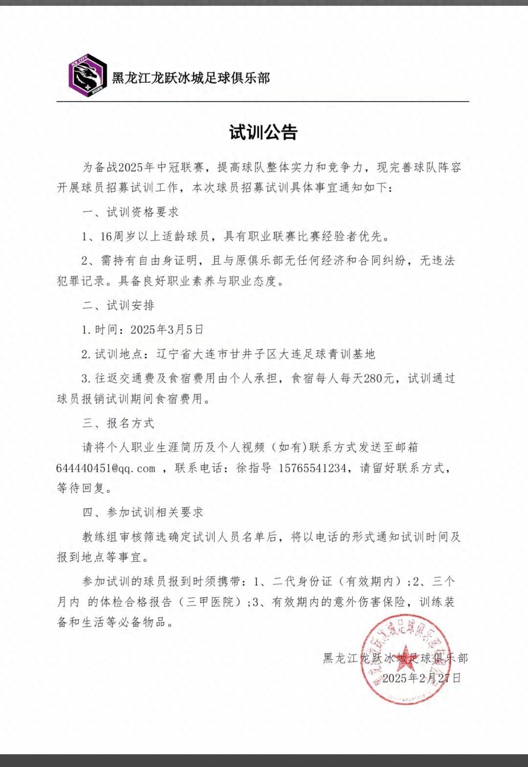 北京時間2月27日,黑龍江龍躍冰城足球俱樂部發布球員招募試訓公告,將備戰2025年中冠聯賽。