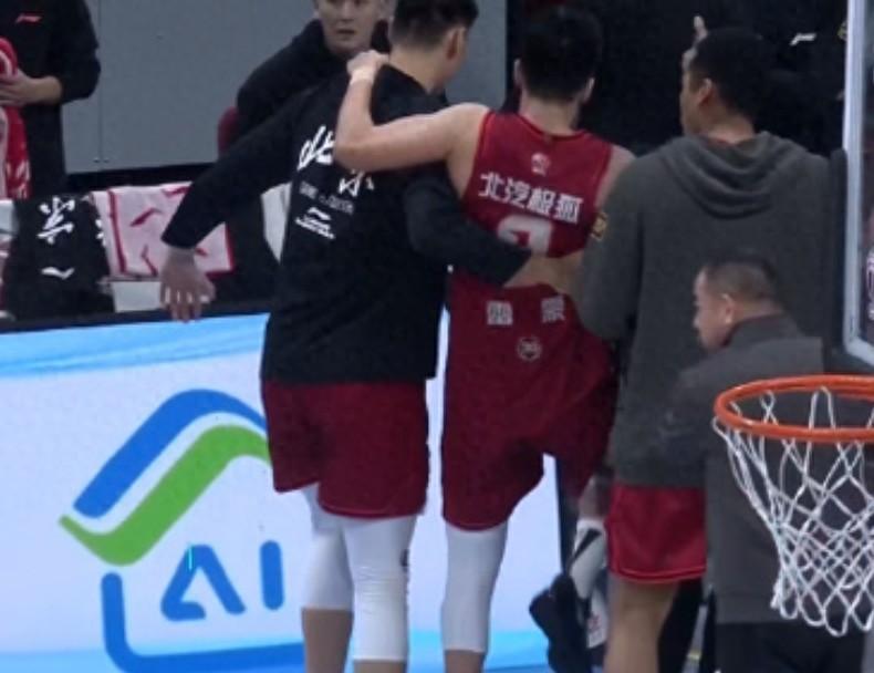 在比賽第三節裏,北京男籃球員雷蒙在無對抗情況下受傷,隨後被隊友扶下場。