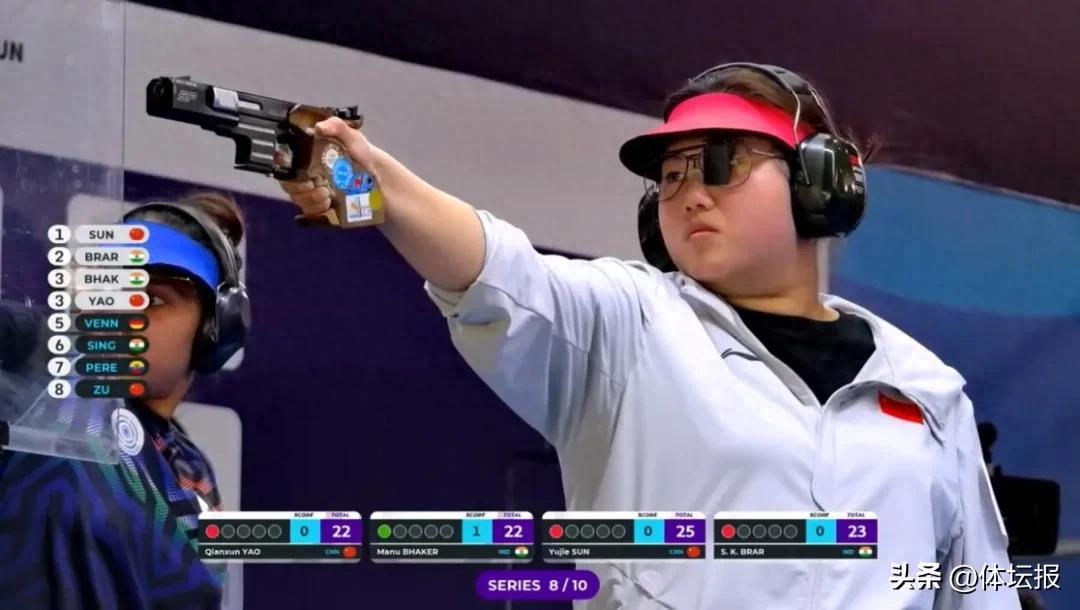 在至關重要的最後一組射擊中,孫瑜潔和印度選手再次貢獻出勢均力敵的表現,都打出3中,不過孫瑜潔憑藉此前積累的優勢,以34中的總成績將這枚金牌收入囊中。