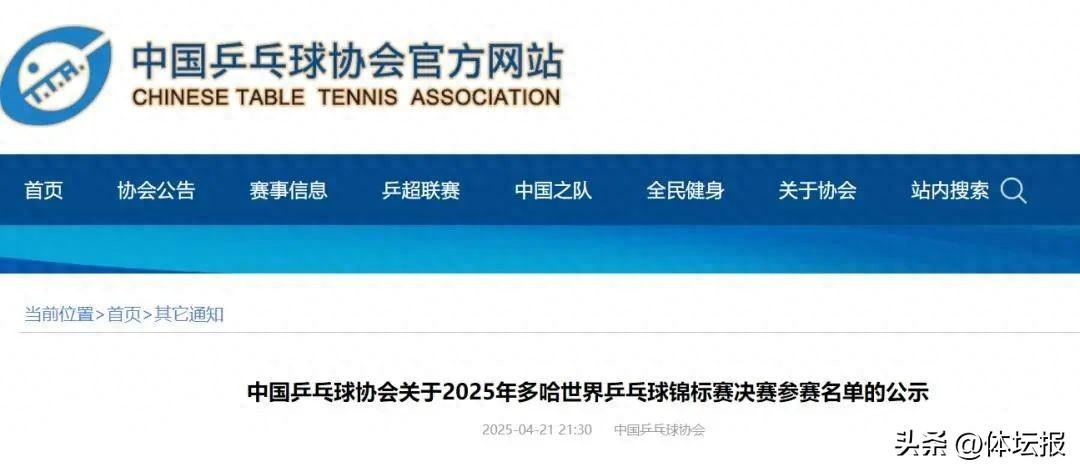 4月21日晚,中國乒協在官網公示了中國乒乓球隊參加2025年多哈世乒賽名單。