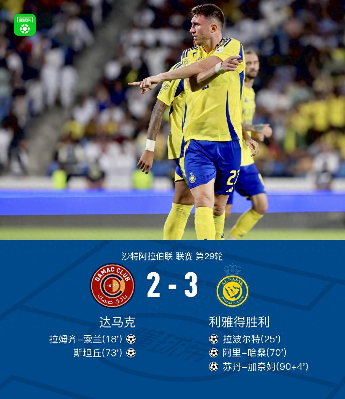 利雅得勝利3-2絕殺達馬克,C羅輪休,斯坦丘、拉波爾特破門
